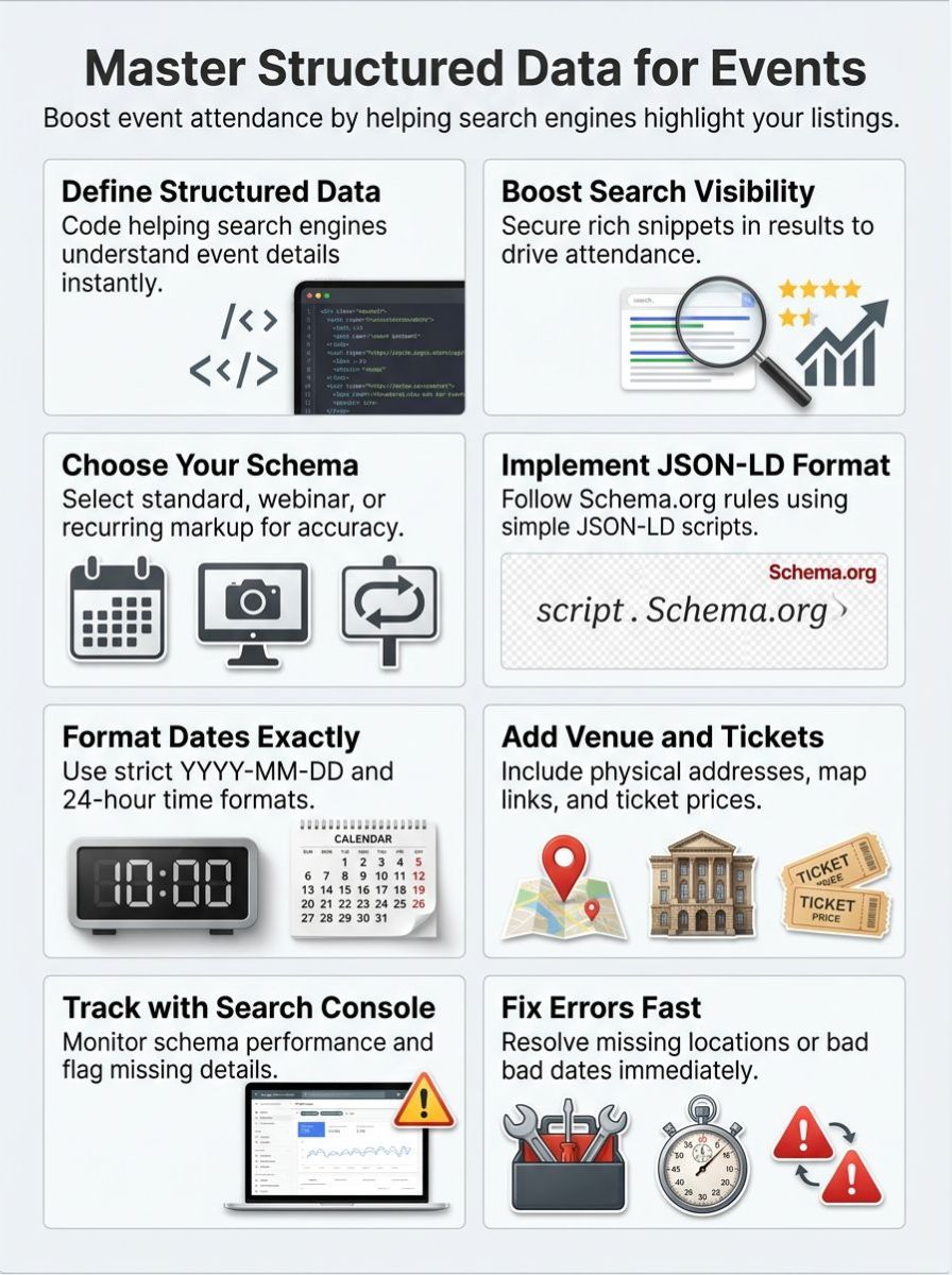 When creating event schema markup, check your date and time formats for accuracy, include clear location details, and make sure to provide ticketing information. Want to learn more about making your events shine online?