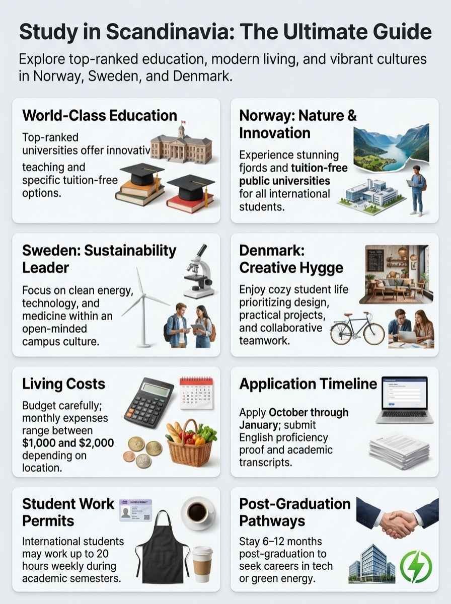 Choosing Scandinavia for your studies opens doors to quality education. You get to experience new cultures and amazing career paths. The steps are clear. The costs can be managed with good planning. There is strong support through scholarships and work options. Each country offers its own flavor of life. You get fjords in one place and cozy cafes in another. Tips from this guide help make big decisions easier.