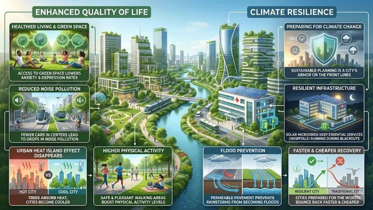 When you remove cars from the center, noise pollution drops. When you add trees, the “Urban Heat Island” effect (where concrete makes cities hotter than the countryside) disappears. Residents in sustainable cities often report higher physical activity levels because walking is safe and pleasant.