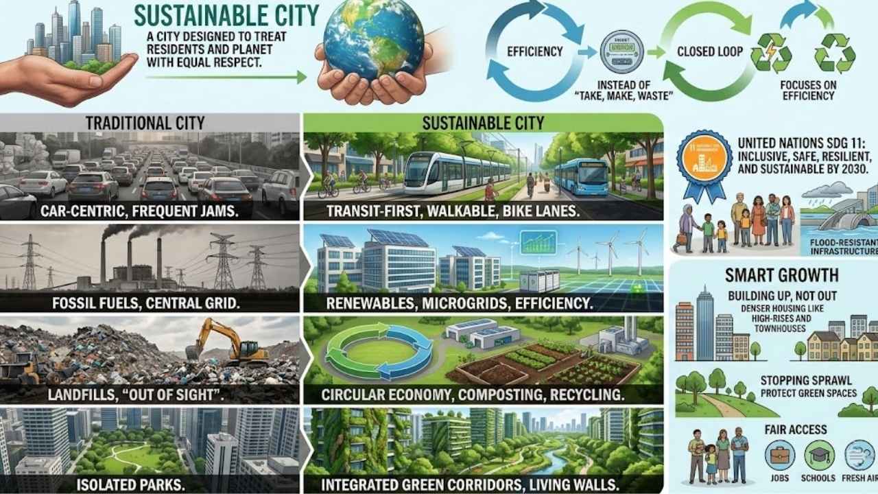 Think of it as a closed loop. Instead of “take, make, waste,” a sustainable city focuses on efficiency. It uses renewable energy to keep the lights on and green infrastructure to handle the rain. The United Nations Sustainable Development Goal 11 specifically targets making cities “inclusive, safe, resilient, and sustainable” by 2030.