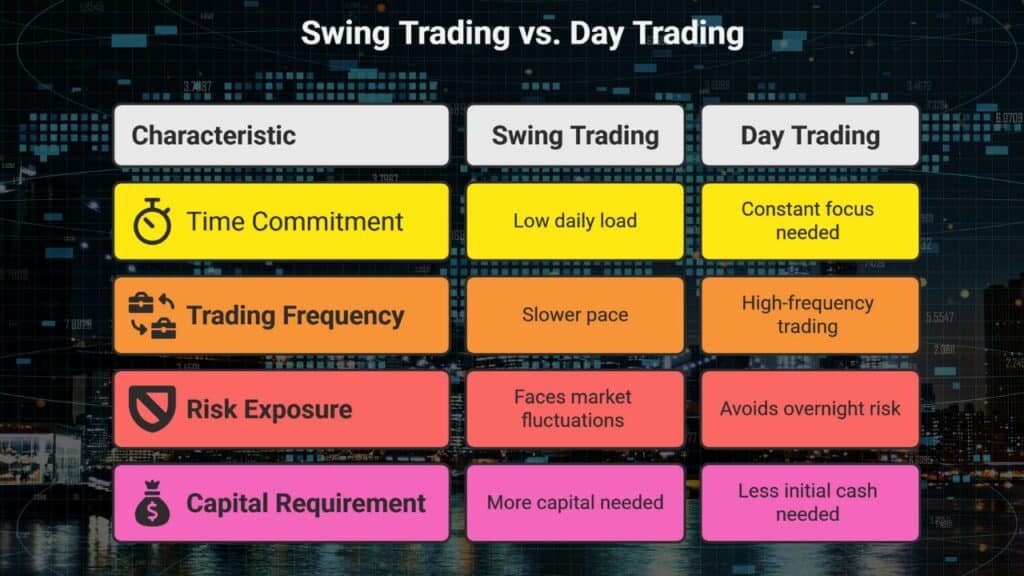 Swing trading often needs less capital. You can trade with small margin. Day trading may face high transaction costs and strict margin rules on trading platforms. Both can run in financial markets, from the forex market to the stock exchange.