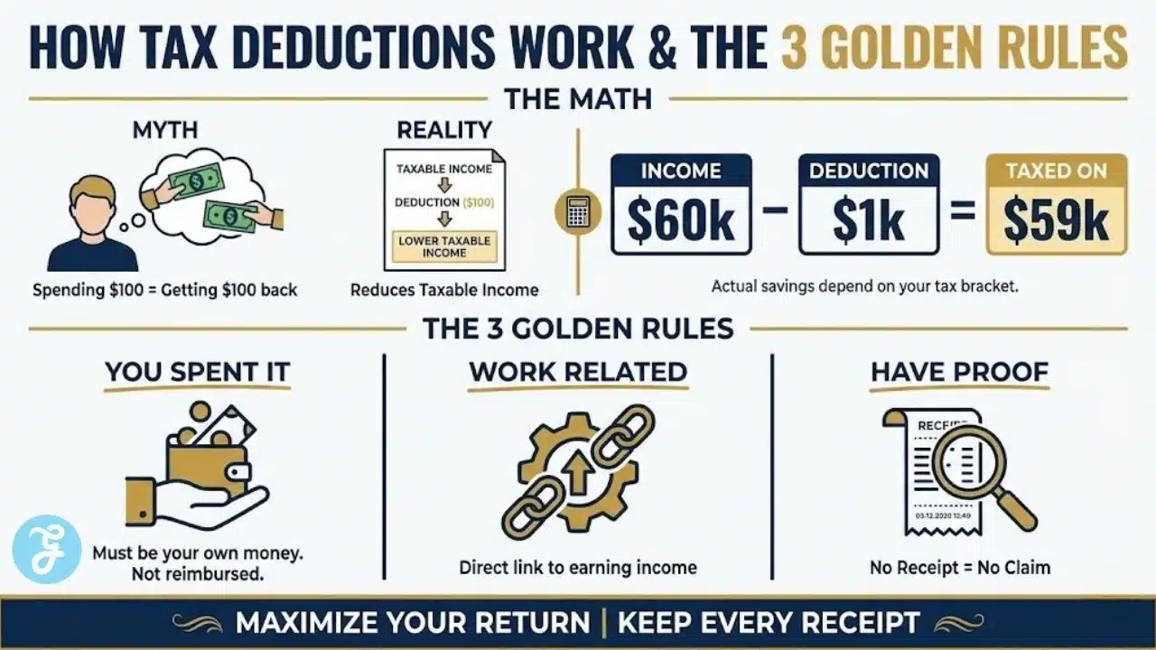 Think of a tax deduction as a way to lower the amount of income you are taxed on. If you earn $60,000 a year and claim $1,000 in deductions, the ATO treats you as if you only earned $59,000.