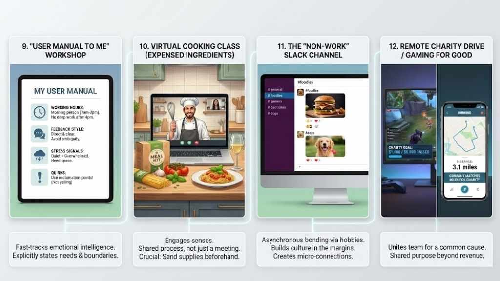 Building a remote team isn’t about replicating the office—it’s about creating new rituals that fit the medium. The goal of these activities isn’t to force everyone to be best friends. It is to create enough psychological safety that when a work crisis hits, your team feels comfortable reaching out to one another.