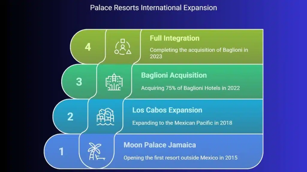 One of the most significant steps in its international expansion took place in 2022, when the company announced the purchase of 75% of the Italy-based Baglioni Hotels & Resorts chain. This transaction included properties in cities such as Rome, Florence, Milan and Venice, as well as resorts in destinations such as the Maldives. In October 2023, Palace Resorts completed the acquisition of 100% of Baglioni, fully integrating that brand into its operating structure. This acquisition marked the company’s formal entry into the European urban hotel segment, as well as its geographic diversification beyond exclusively beach destinations.