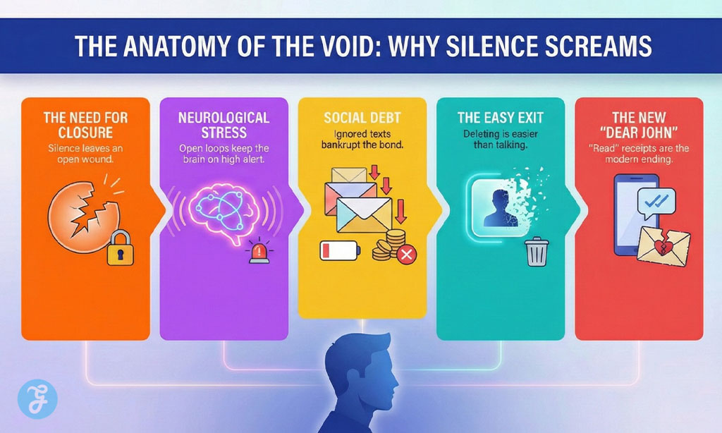 The human brain is a completion machine, biologically programmed to resolve every sentence. In Gestalt psychology, the “law of closure” dictates that when we encounter a gap, our minds reflexively bridge the distance to create a whole. Relationships demand the same finality; we require the “full stop” to process an ending. When a partner initiates The Silent Departure, they leave an open wound in the narrative. Deprived of a concrete explanation, the brain enters a state of frantic internal searching, often inventing self-inflicted reasons far more cruel than any spoken truth.