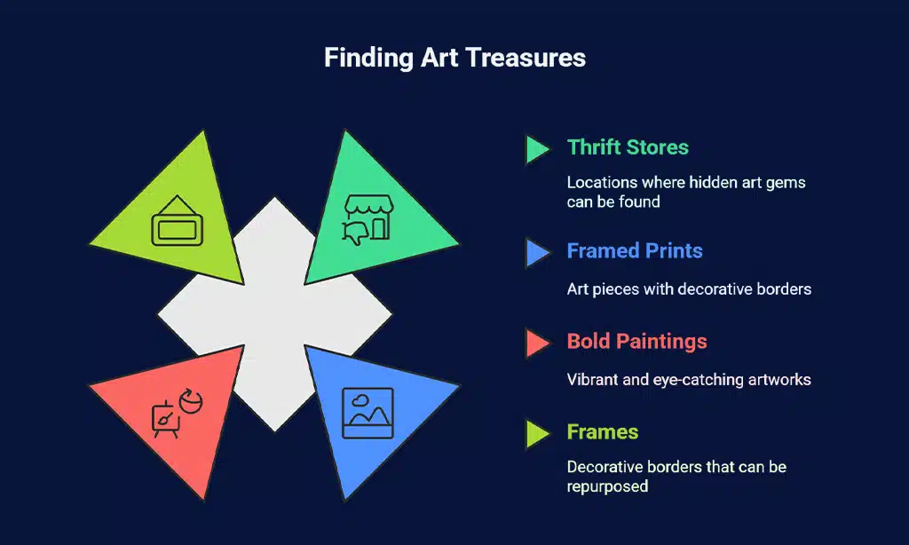 Hunt for hidden gems in thrift stores, like framed prints or bold paintings. Sometimes the frame alone is worth snagging for a DIY project!