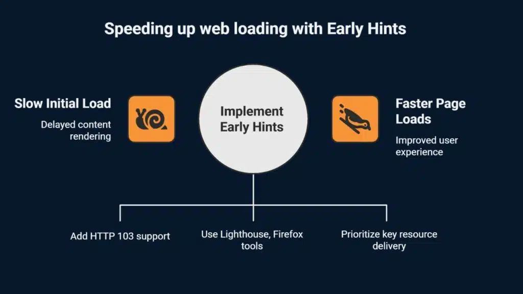 Early Hints (HTTP 103) sends a quick header while the server crafts the full reply. A browser starts fetching key assets, like CSS or scripts, before the main response arrives. This tactic slashes time to first byte on navigation requests and boosts core web vitals.