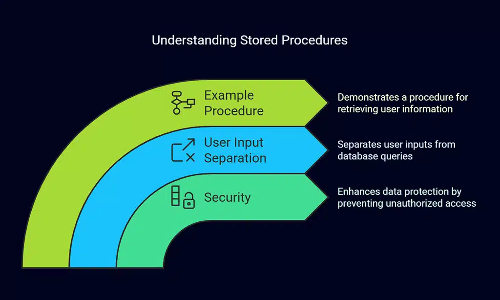 Stored procedures are precompiled SQL statements that are stored and executed within the database. They allow businesses to control how data is queried, reducing the possibility of unauthorized SQL code execution. By using stored procedures, you separate user inputs from database queries, enhancing security.