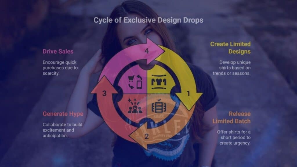 When a customer knows a shirt may not be back once it’s sold out, they tend to feel compelled to take action quickly. Consider dropping a limited batch of shirts for a limited time by creating them based on seasons, what’s trending now, or just something fun. Additionally, collaborate with a local artist or friend to help you generate the hype and provide your audience with something fresh to anticipate.