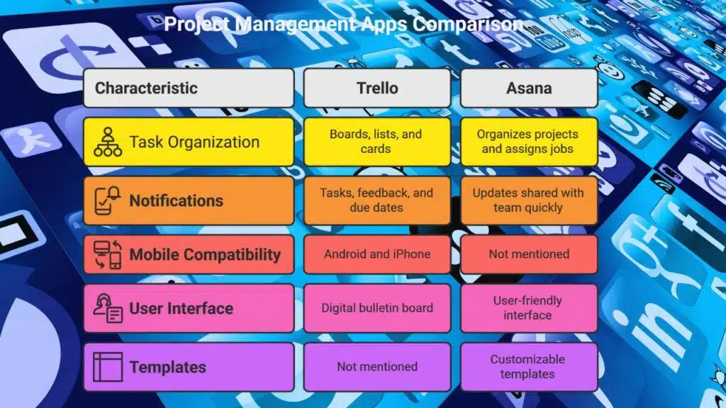 - Trello organizes tasks visually with boards and sends deadline alerts on Android and iPhone.