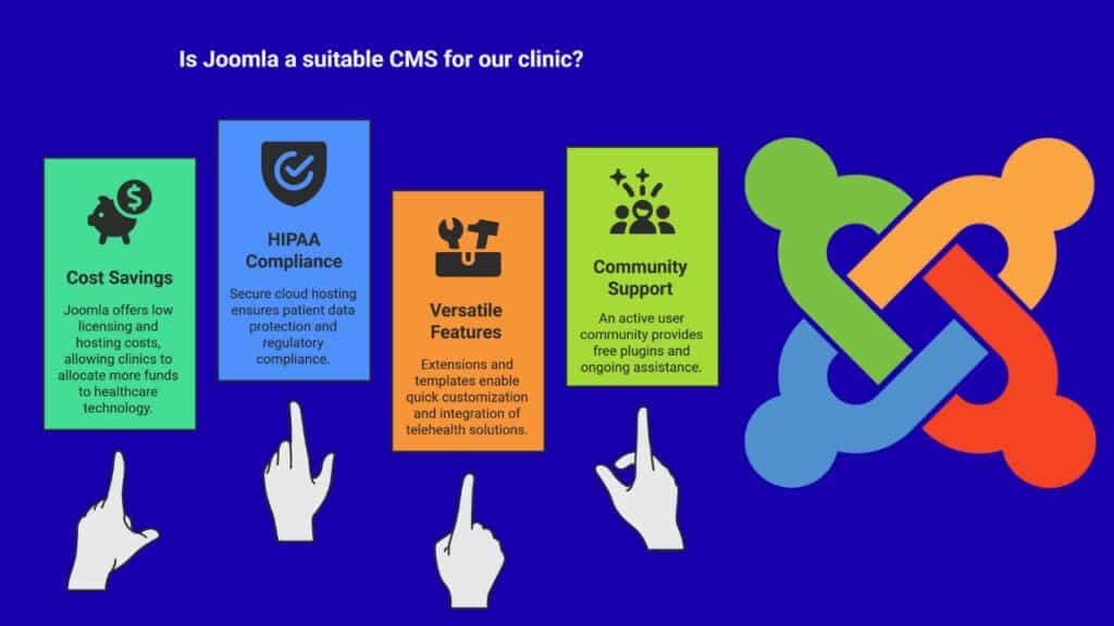 Joomla costs little to license. Clinics save on hosting and in-house IT. Free core code lets small teams focus on patient care. A HIPAA compliant cloud protects records with Amazon Web Services or Microsoft Azure services.