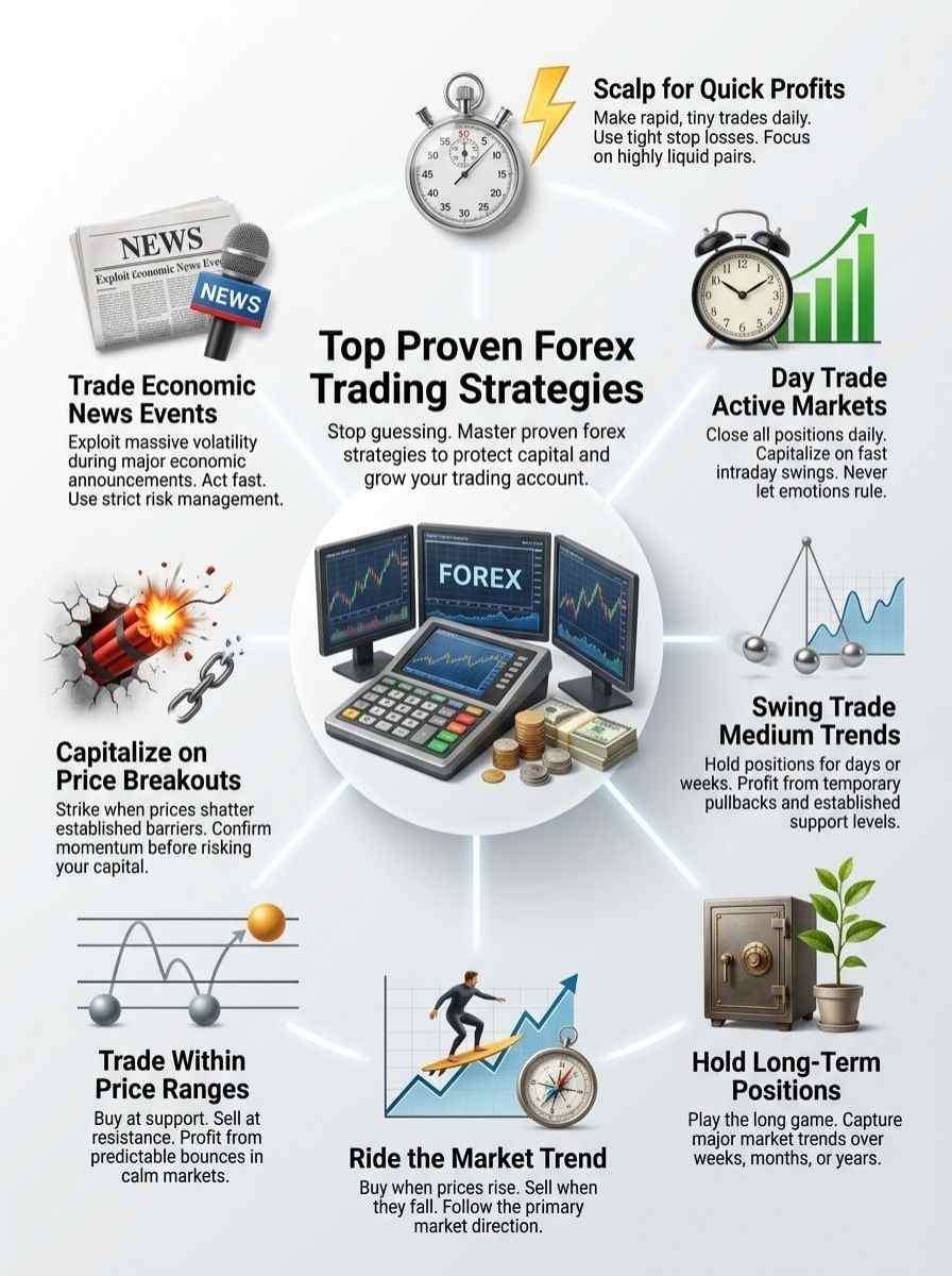 Traders use ten proven strategies to make money in the forex market every single day. Each strategy works best for different traders, market conditions, and time frames.