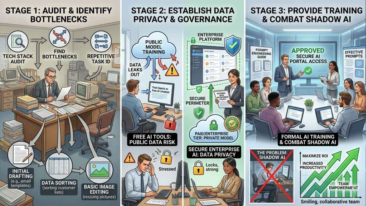 Finally, combat “shadow AI”—where employees use unapproved AI tools secretly—by providing formal training. Embrace the technology openly, give your team access to secure, approved platforms, and train them on how to write effective prompts to maximize ROI.
