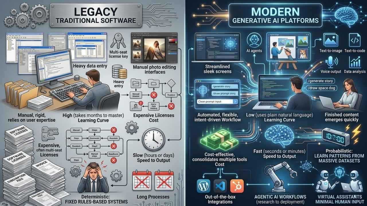 The transition from legacy software to AI platforms is the shift from deterministic software to probabilistic software. Traditional software is deterministic, meaning it requires you to click specific buttons in a specific order to get a specific result. It relies entirely on your manual input and knowledge of the interface. Generative AI is probabilistic. It understands your intent through natural language and does the heavy lifting for you, generating the final output based on your commands.