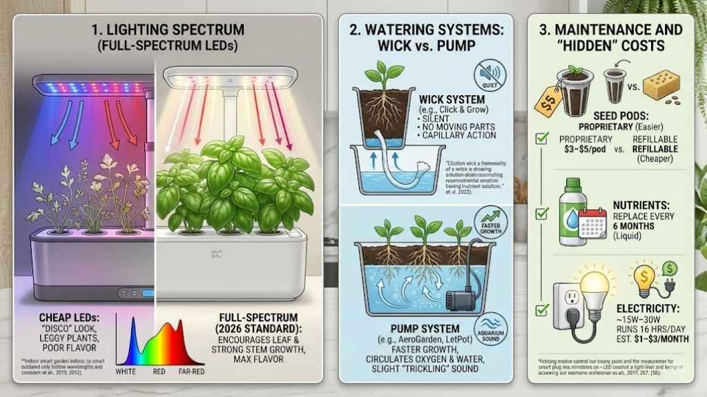 Herbs need light to produce the essential oils that give them flavor. Look for systems that offer full-spectrum LEDs. Some cheaper models only use blue and red lights (making your kitchen look like a 1980s disco). High-quality systems in 2026 use a mix of white, red, and far-red lights to encourage both leaf growth and strong stems.
