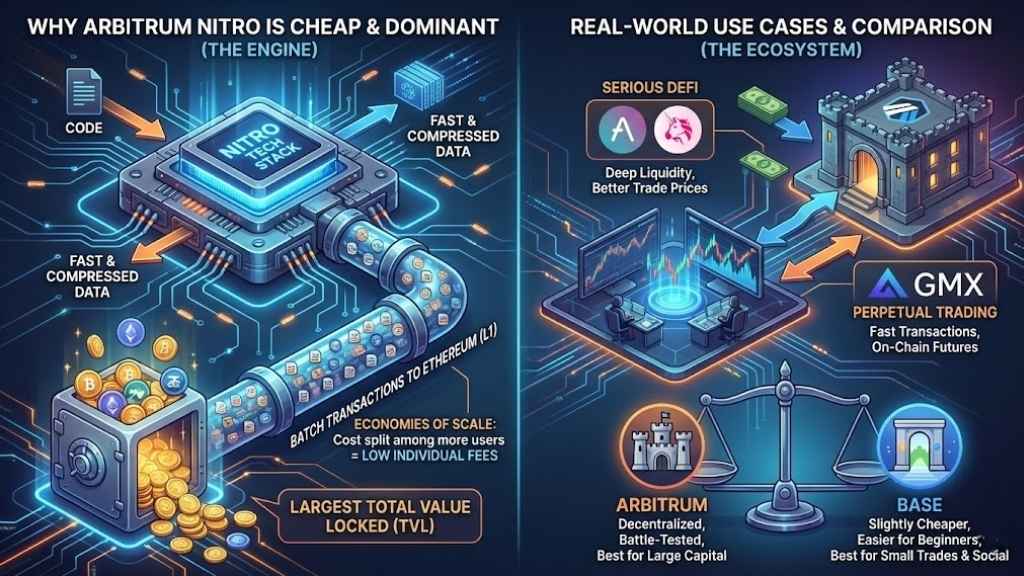 Arbitrum uses a tech stack called Nitro. Nitro compiles the code to run fast and compresses data tightly before sending it to Ethereum. Even though it is the busiest network, its “economies of scale” keep fees low. When more people use Arbitrum, the cost to post a “batch” of transactions to Ethereum is split among more users, keeping individual costs down.