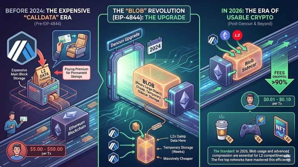 Back in 2024, Ethereum underwent a major upgrade known as Dencun (EIP-4844). Before this, Layer-2 networks had to squeeze their transaction data into the expensive “calldata” section of an Ethereum block. It was like paying for a first-class seat just to send a postcard.