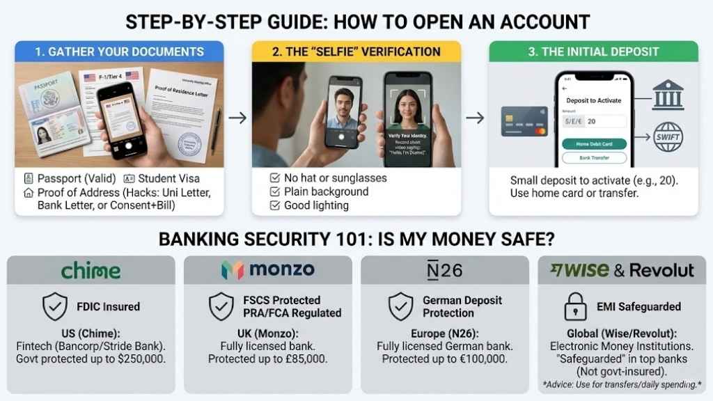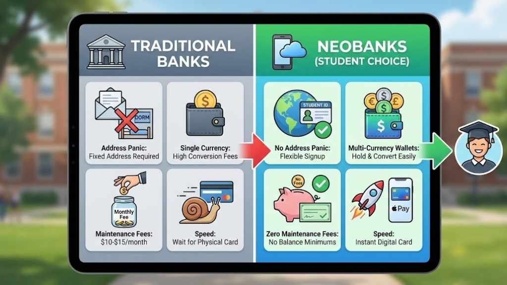 - No Physical Address Panic: Many neobanks allow you to sign up using your home country’s address initially or accept a temporary student dorm address.