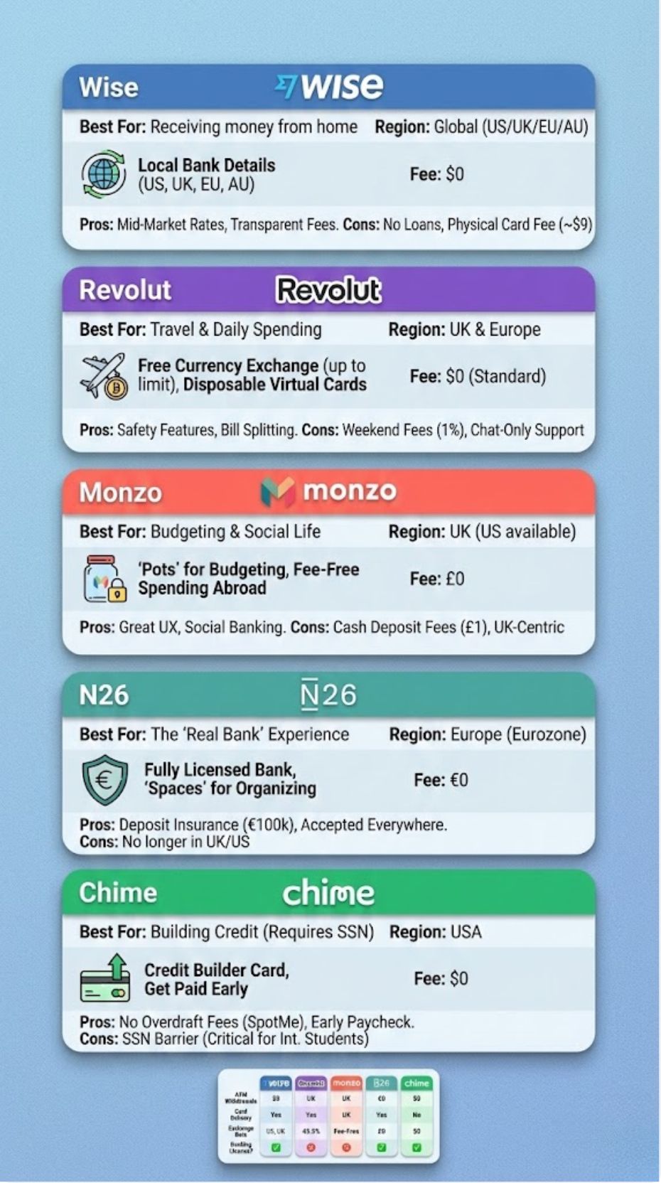 - Advice: Keep your bulk savings (tuition) in a licensed bank (Monzo/N26/Chase) and use Wise/Revolut for transfers and daily spending.