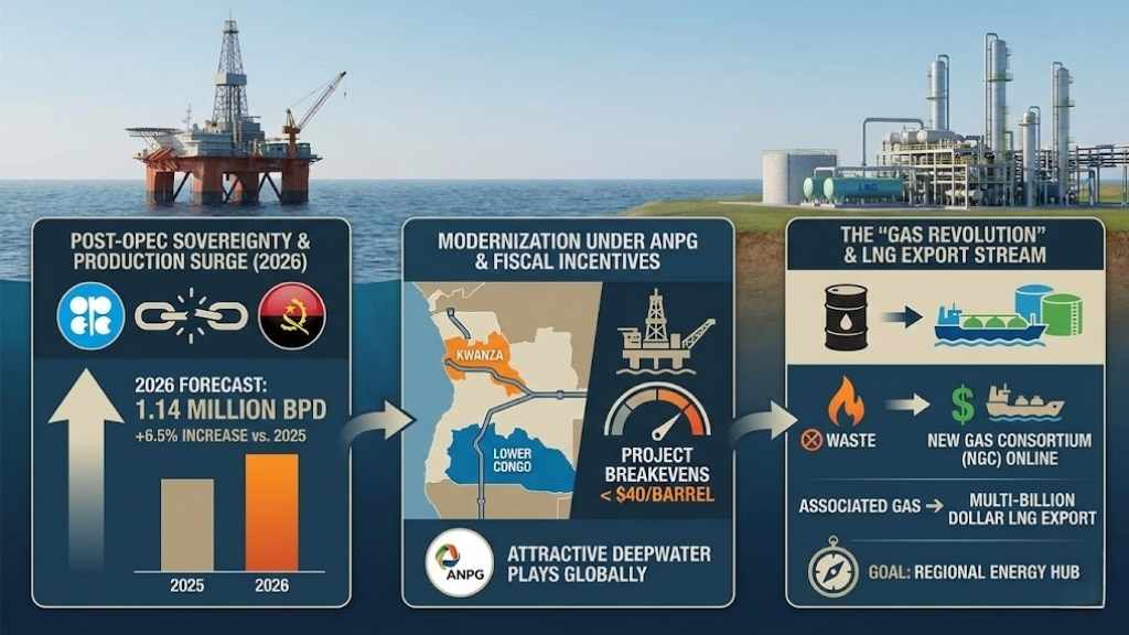 While oil remains king, 2026 marks the year of the “Gas Revolution.” The New Gas Consortium (NGC) is finally coming online, turning previously “wasted” associated gas into a multi-billion dollar LNG export stream. This transition is crucial for Angola’s goal of becoming a regional energy hub.