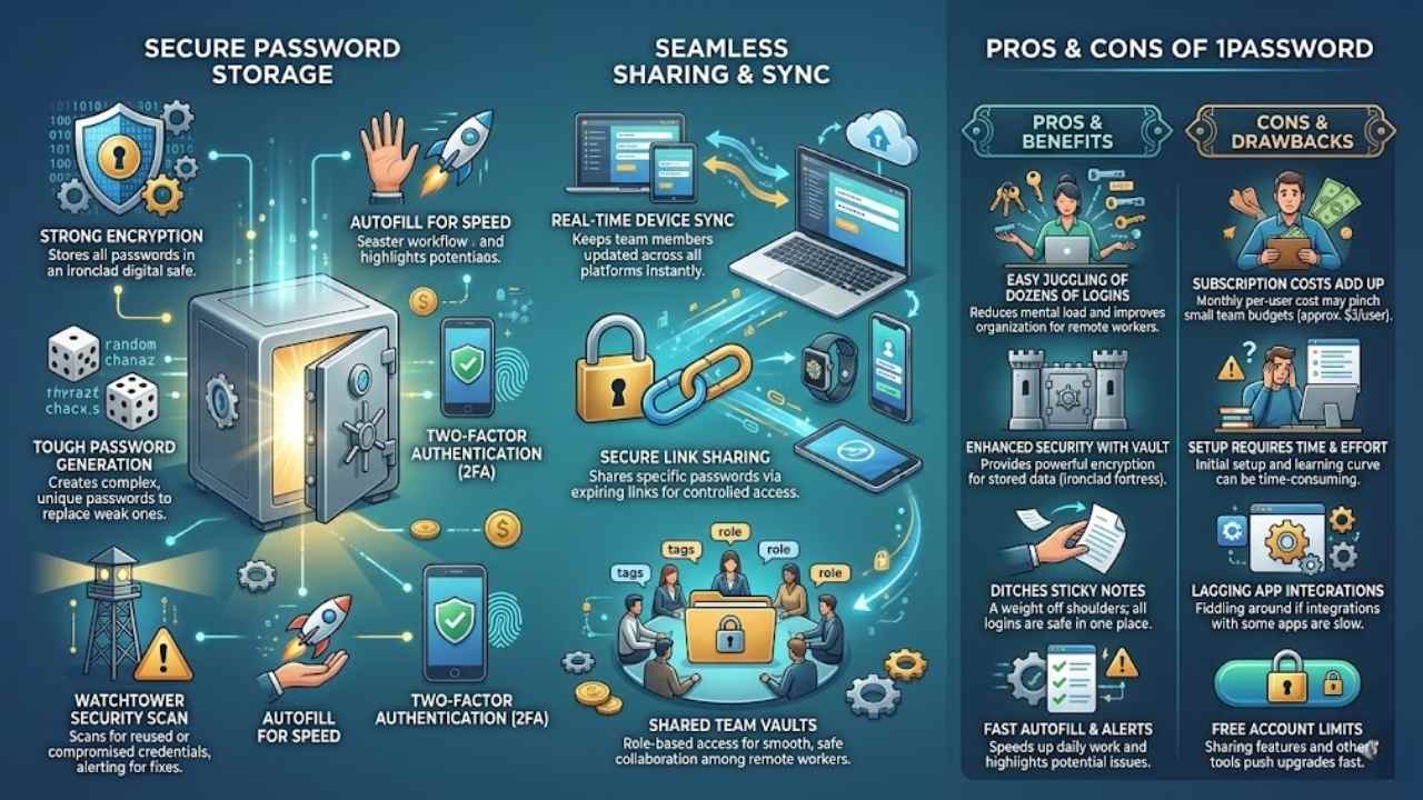 Imagine juggling dozens of logins without dropping the ball, that’s where this tool shines for remote workers. It stores your codes in a locked vault, shares them with ease across devices, and even spots weak spots in your setup—want the full scoop on its perks and pitfalls?