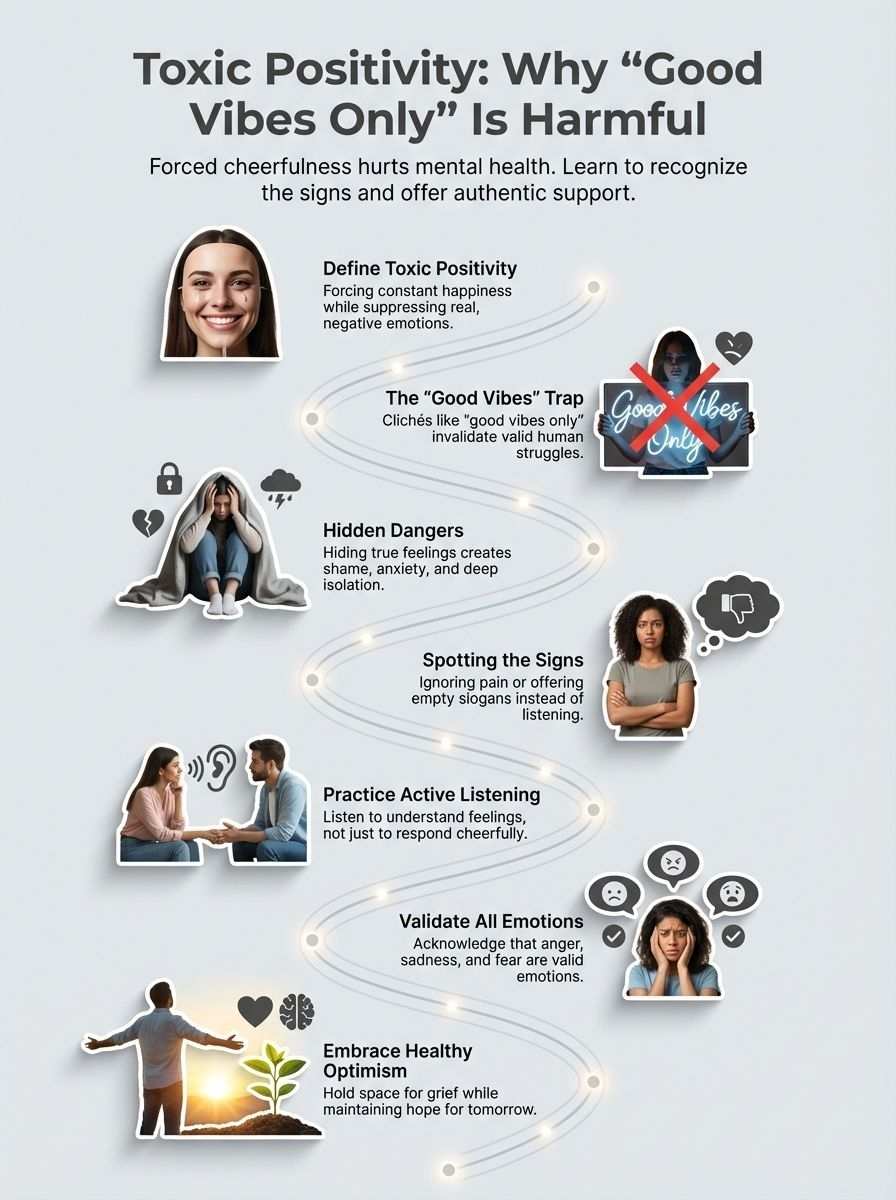 Toxic positivity may sound warm and fuzzy, but it can hurt more than heal. Listening, showing empathy, and giving space for every emotion is doable for anyone. These are easy ways to support real mental health.