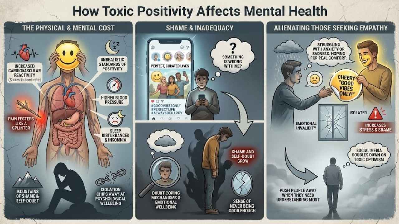 Pushing away sadness, stress, or anger does not make them vanish. Toxic positivity messages like “good vibes only” often tell people to ignore how they truly feel. This can cause emotional suppression and may lead to anxiety, shame, or even worse mental health over time.
