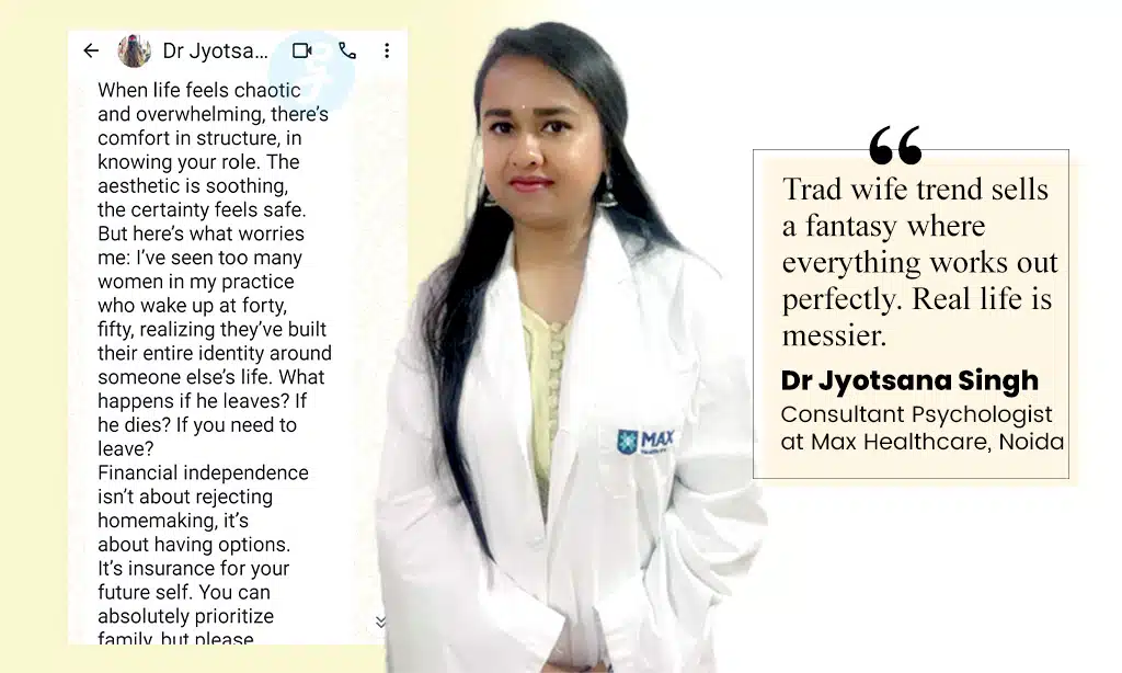 “When life feels chaotic and overwhelming, there’s comfort in structure, in knowing your role. The aesthetic is soothing, the certainty feels safe. But here’s what worries me: I have seen too many women in my practice who wake up at forty or fifty, realizing they have built their entire identity around someone else’s life. What happens if he leaves? If he dies? If you need to leave?