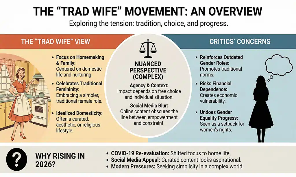 The “Trad wife” movement has been rising in popularity on social media. The movement did not appear overnight. It really took off during the COVID-19 lockdowns and has continued well into 2026. It was when influencers started sharing a lifestyle centred on traditional gender roles. These women often appear conventionally attractive and well-off. They embrace the role of a “traditional wife,” focusing on homemaking and supporting their husbands as the main earners.