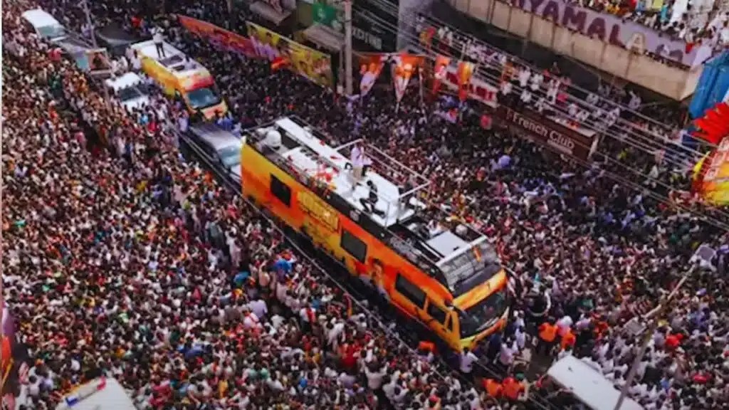 Crowds had assembled at the rally ground long before the program’s scheduled start. Local media reported that thousands of people began arriving by noon, with many traveling from nearby towns and districts to catch a glimpse of Vijay.