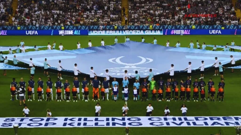 - At the UEFA Super Cup final in Udine, Italy, banners saying “Stop Killing Children” and “Stop Killing Civilians” were placed on the field in front of the teams, signaling UEFA’s growing discomfort.