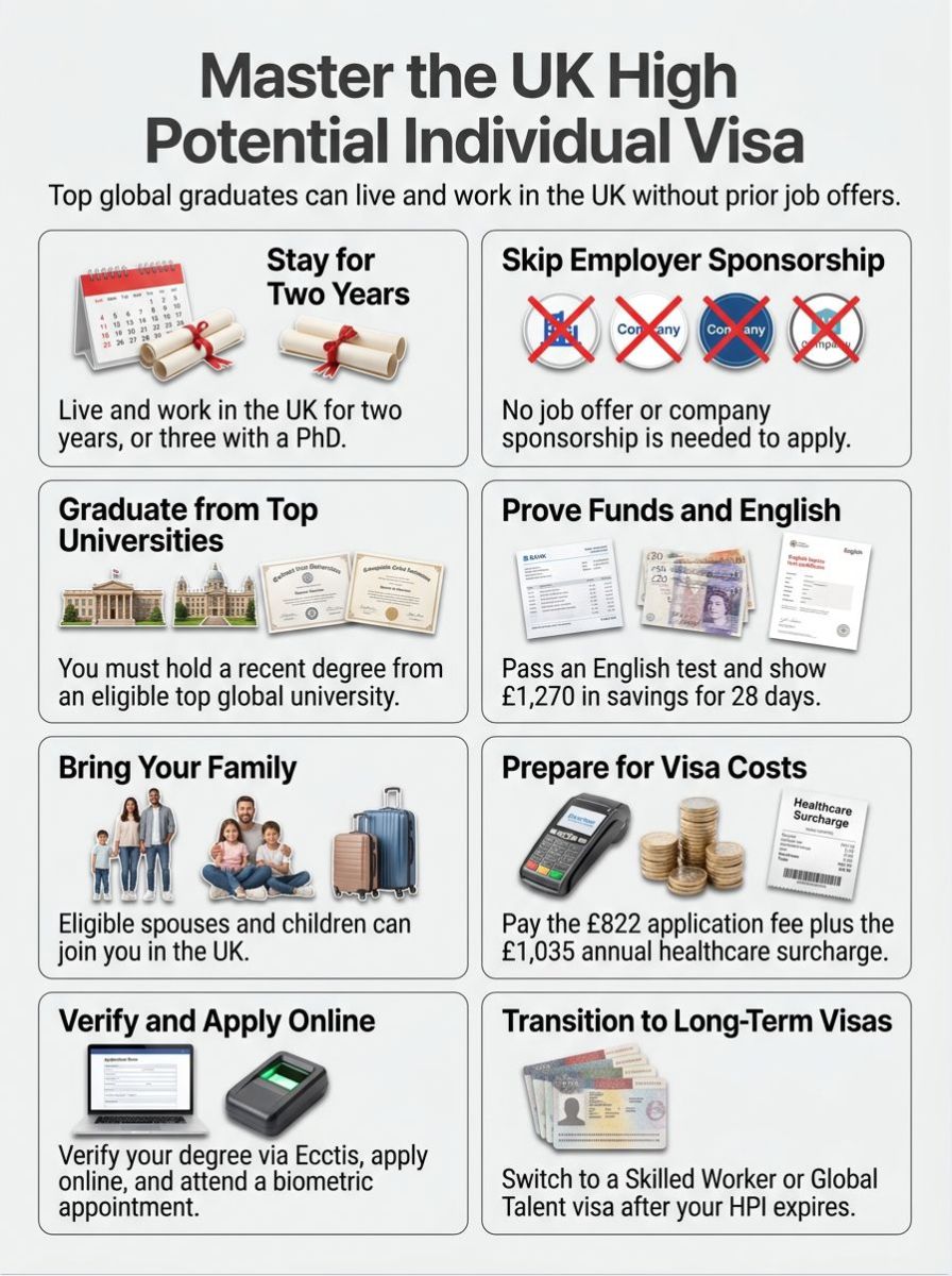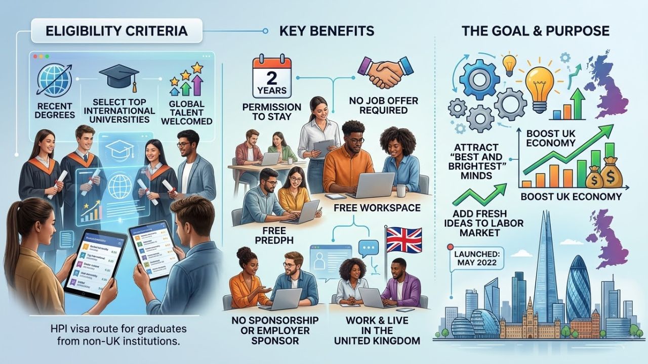 The UK High Potential Individual (HPI) visa lets top global graduates work and live in the United Kingdom. This short-term work visa gives permission to stay for 2 years. No job offer, sponsorship, or employer is needed.