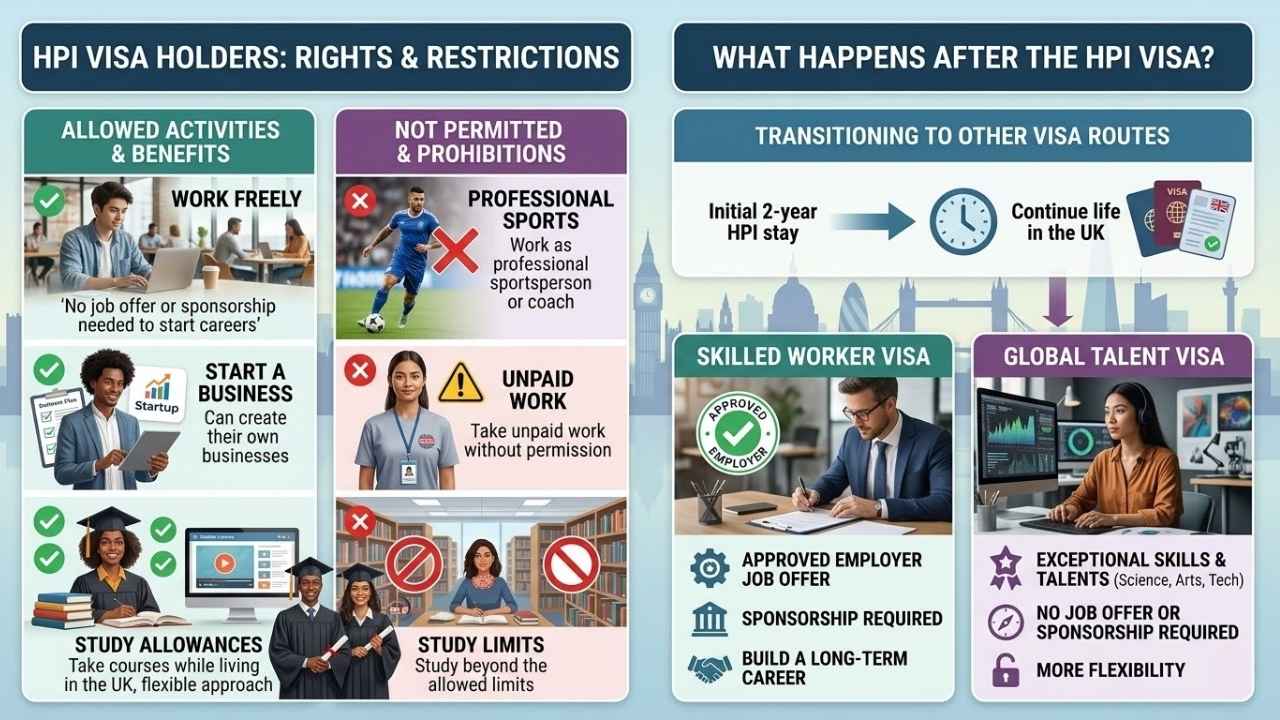 HPI visa holders can work freely in the UK. They do not need a job offer or sponsorship to start their careers. This allows graduates from top universities to search for jobs easily.
