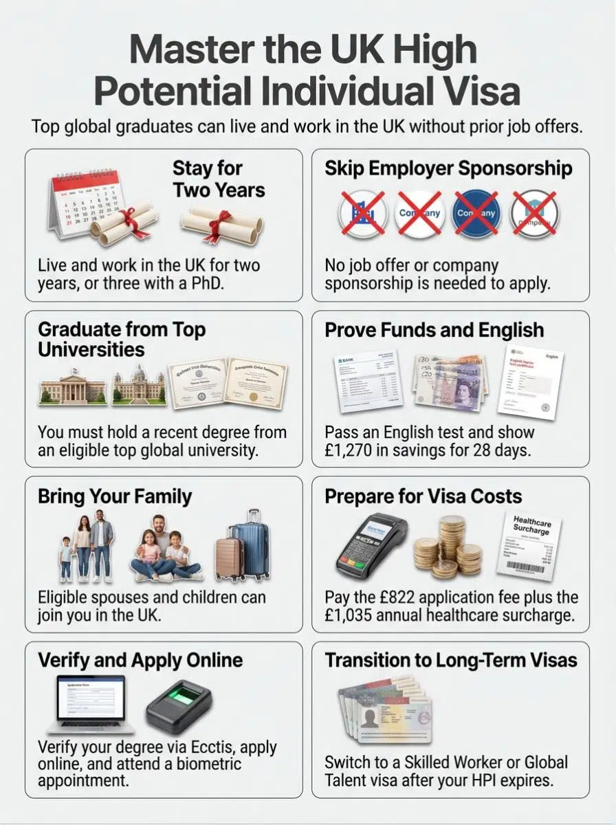 The UK High Potential Individual (HPI) visa lets top global graduates work and live in the United Kingdom. This short-term work visa gives permission to stay for 2 years. No job offer, sponsorship, or employer is needed.