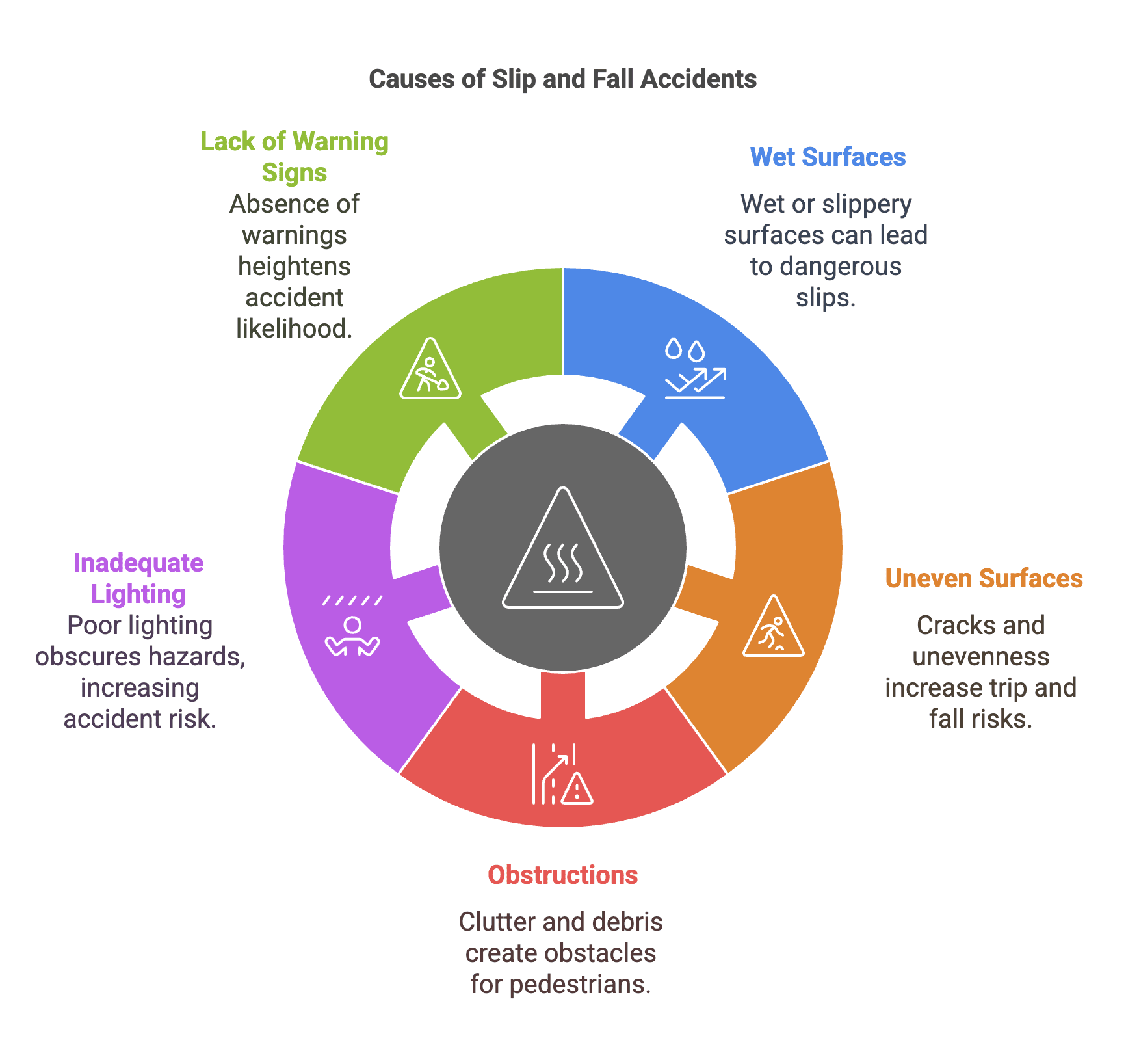 - Uneven Surfaces: Cracks in sidewalks, uneven stairs, or potholes can cause trips and falls.