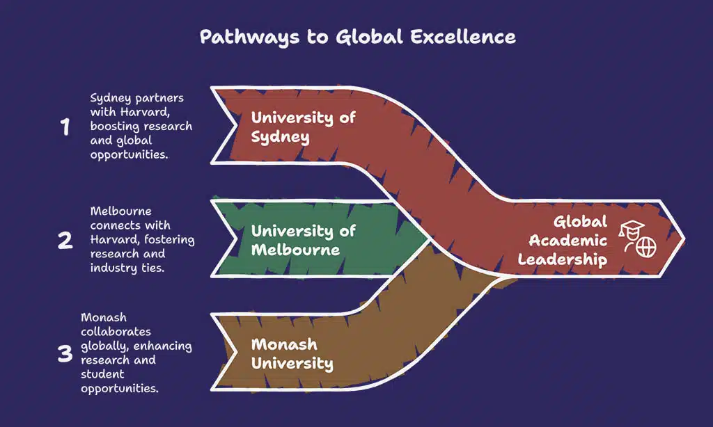 The University of Sydney partners with Harvard in the U.S. Their work boosts research quality and funding opportunities. Other schools like The University of Melbourne and ANU team up globally too, creating smarter solutions for industries worldwide.