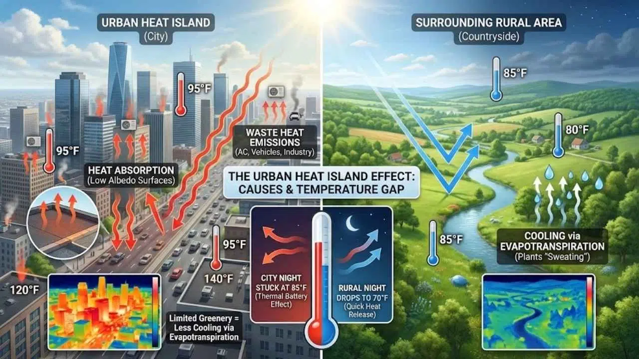Rural areas cool down quickly once the sun sets. The grass and soil release heat fast. Cities, however, act like giant thermal batteries.