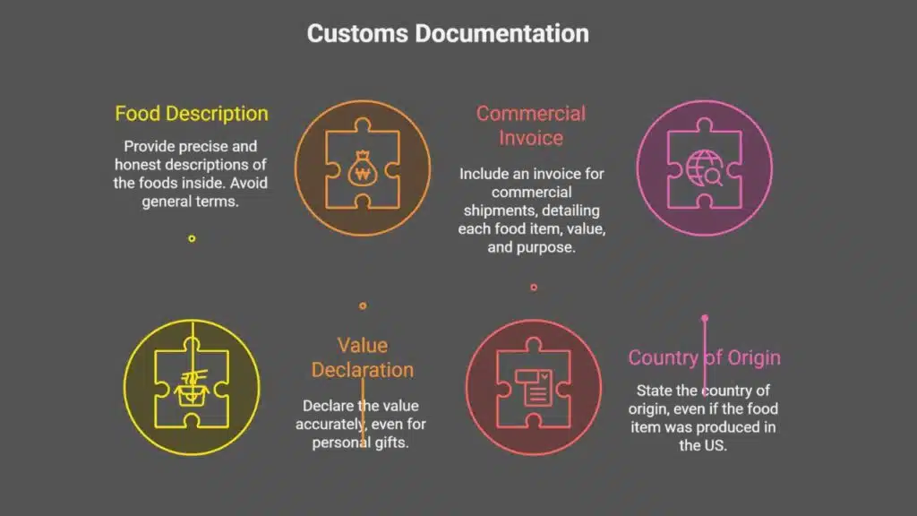 In case your shipment is commercial, you will have to include an invoice. This document will detail each food item, its value, and the purpose of the shipment. State the country of origin, even if the food item was produced in the US.