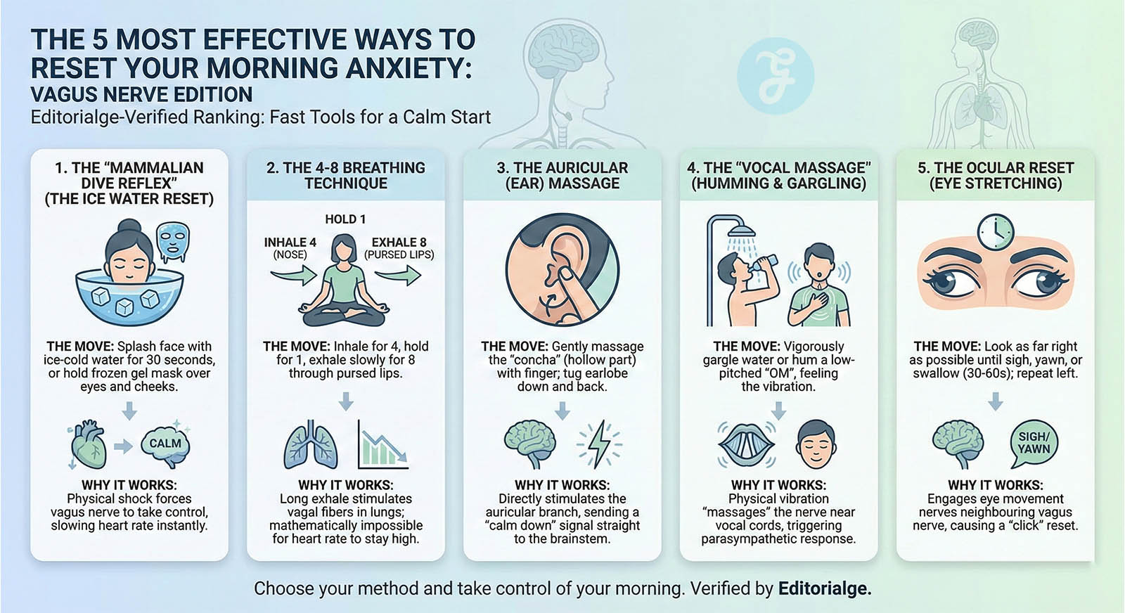 Here is our Editorialge-verified ranking of the best methods for a vagus nerve reset for morning anxiety: