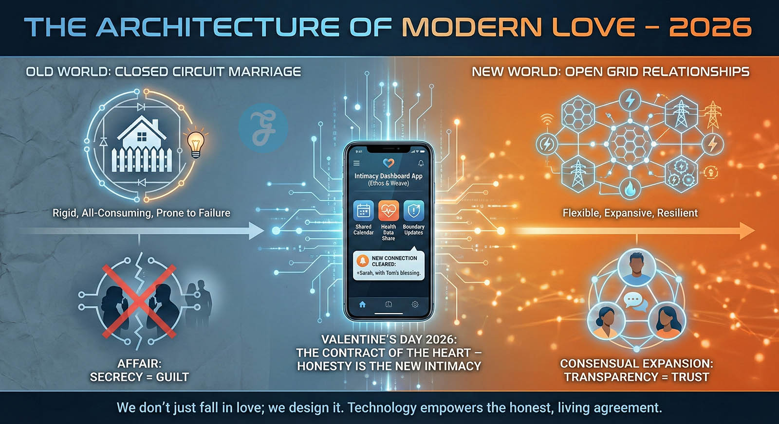 In 2026, we don’t ‘fall’ in love; we design it. The rigid ‘white picket fence’ has been replaced by flexible Relationship Architectures, where the primary bond is a launchpad, not a cage. The “extra” partner is no longer a threat to the marriage; they are the pressure valve that keeps it from exploding. As you walk past the crowded bistros on a Valentine’s Day evening, you aren’t seeing the death of romance. You are seeing its expansion.