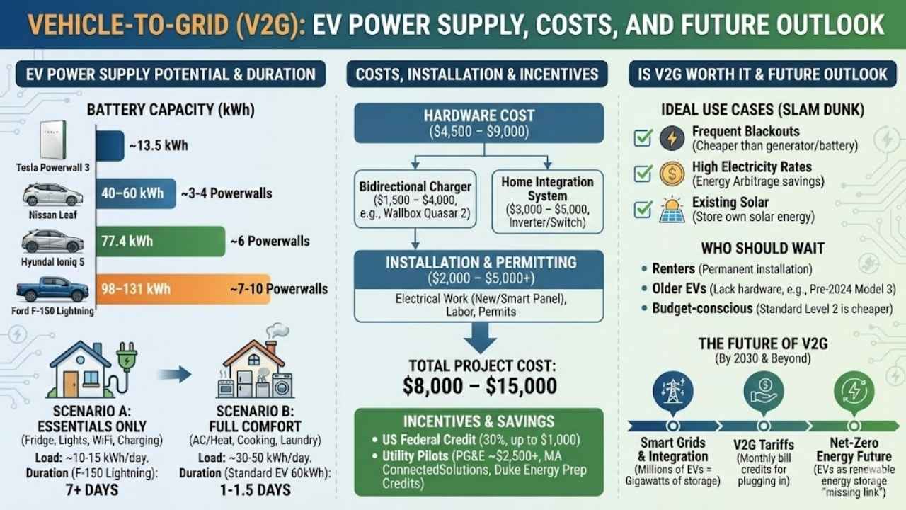 • Total Project Cost: Realistically, a full V2H/V2G setup costs between $8,000 and $15,000.