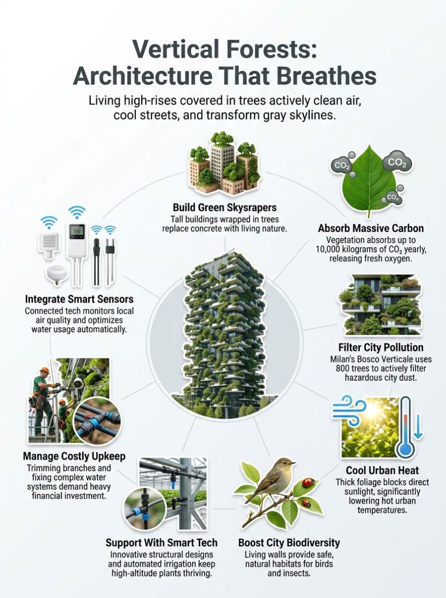 Vertical forests act as green shields for cities. Buildings, like Bosco Verticale in Milan, wear layers of trees and plants that soak up carbon dioxide and pump out fresh oxygen. These structures can filter dust from city air, cut down pollution, and cool the area around them.
