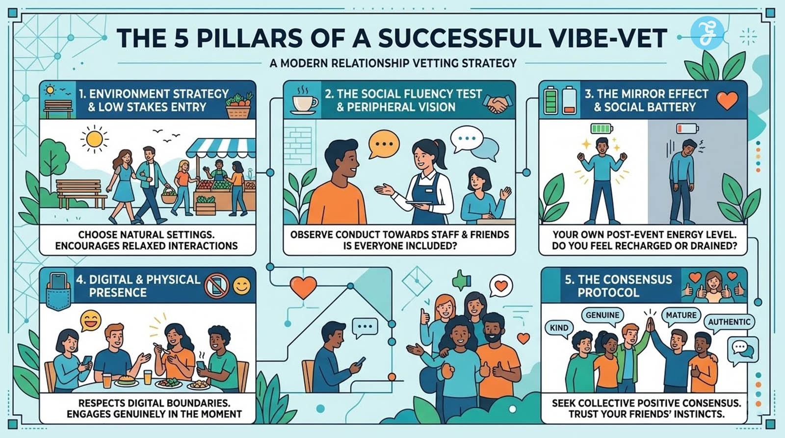 1. Environment Strategy and The Low Stakes Entry: The physical location of the meeting is your foundation. A loud nightclub is a genuinely terrible place for a vibe-vet. You cannot hear anything. The sensory overload masks personality flaws. You need a low stakes environment. You want a Sunday farmers market. You want a casual outdoor activity. You want a daytime gathering where conversation flows naturally. Choosing these relaxed, accessible settings is the first step toward effective vibe-vetting in relationships.