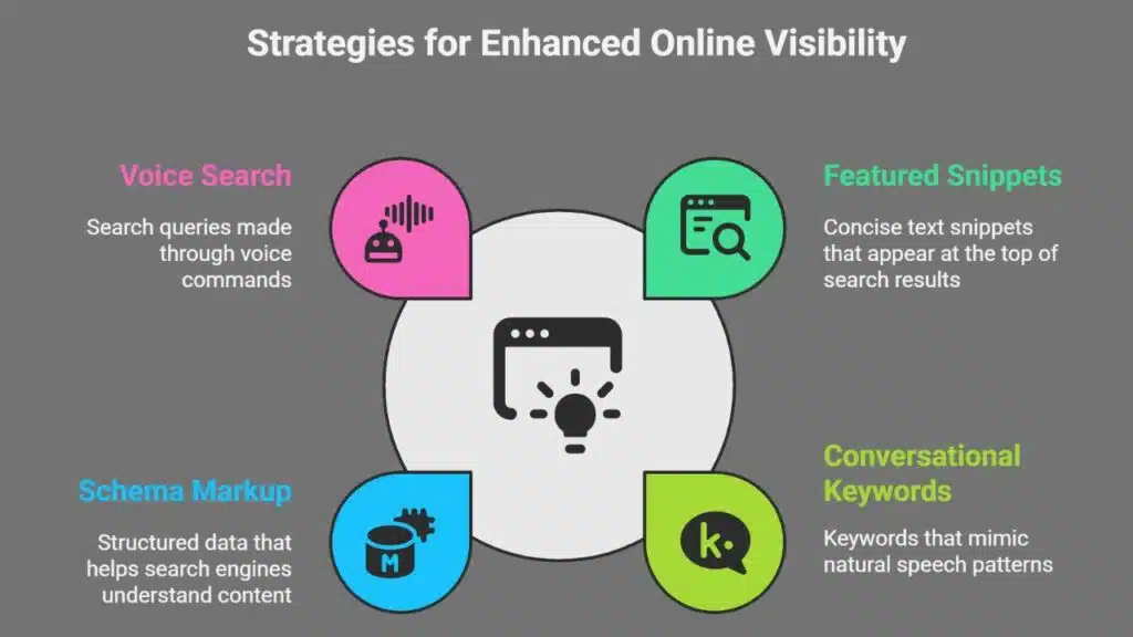 Pick long-tail keywords that match how people talk on voice search queries. Use natural language and add location-based keywords like your city or neighborhood. This helps your content optimization. It makes search engines and google assistant show your page in featured snippets.