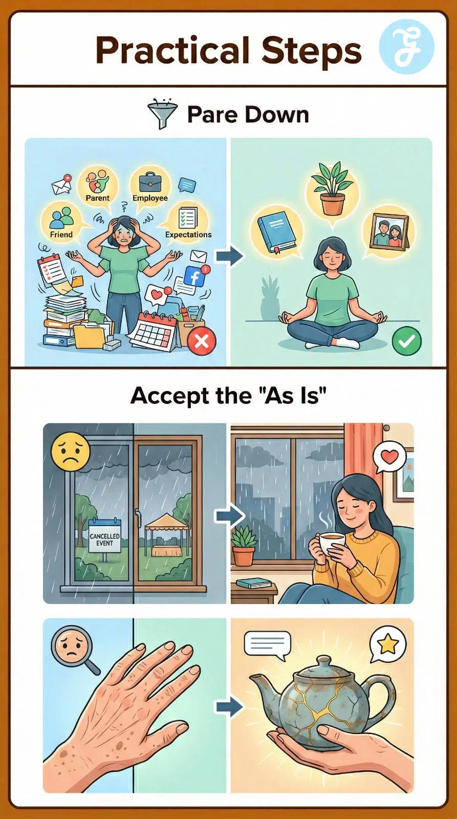 First, we must pare down. Much of our stress comes from the clutter of high expectations. We try to be the perfect parent, the perfect employee, and the perfect friend all at once. Strip away the non-essentials. Focus on the few things that truly bring you inner richness.