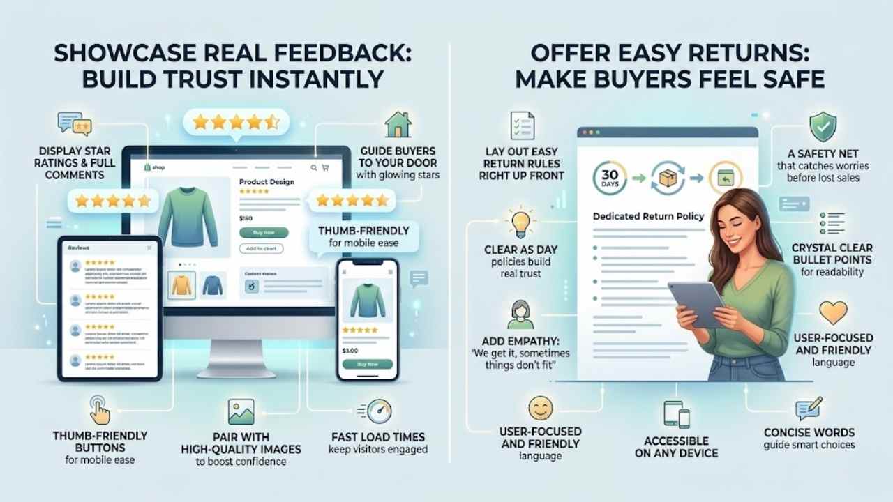 8. Building Trust with Customers: Show off those glowing five-star ratings from happy shoppers, like stars in a night sky guiding buyers to your door. Lay out your easy return rules right up front, clear as day, so folks feel safe hitting that buy button.