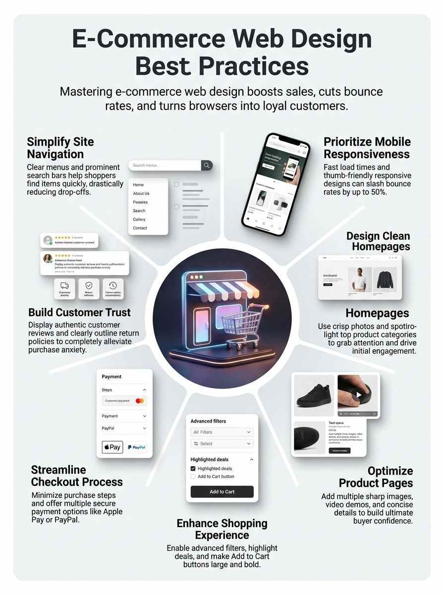 E-commerce website design demands careful thought on many factors that boost user experience and lift conversion rates. Think of your site as a busy store where folks browse and buy.