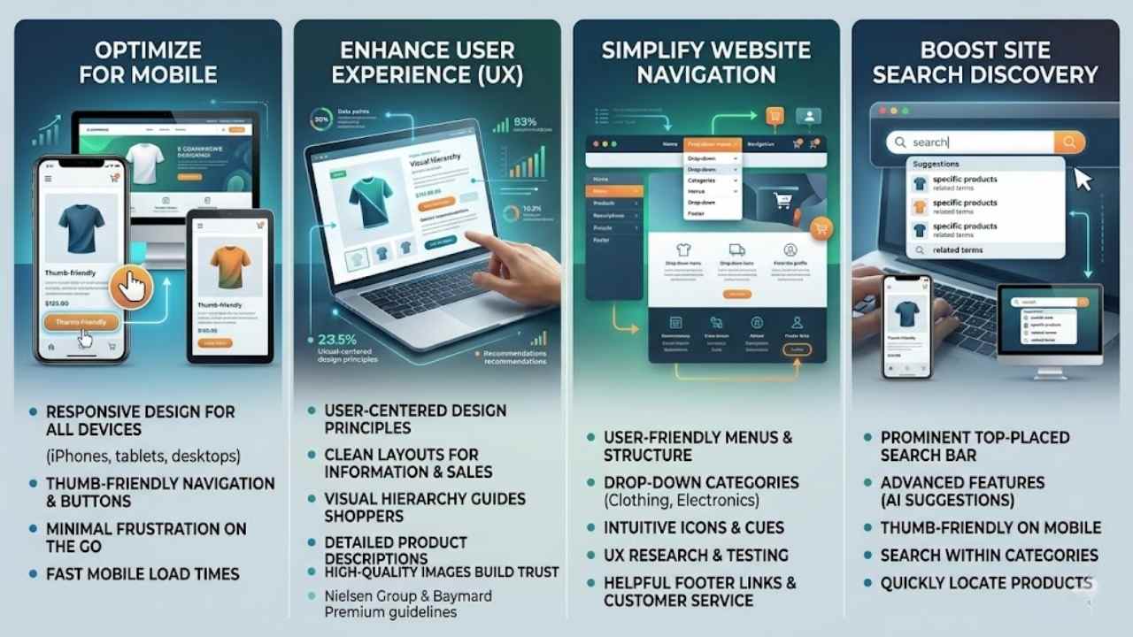 Sites like Newegg and eBags nail this, showing how it builds brand identity and trust. Fast load times keep things zippy, while clean design focuses on what counts. SEO experts note it helps with rankings too, making your site a go-to spot.