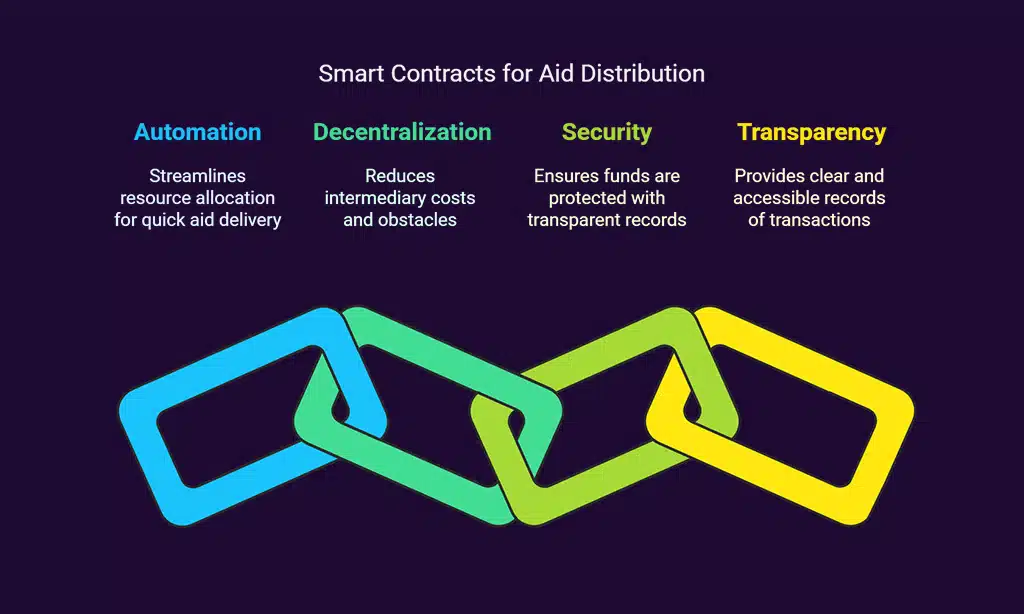 - Smart contracts speed up aid delivery, as seen with the United Nations World Food Programme, ensuring funds reach people fast.