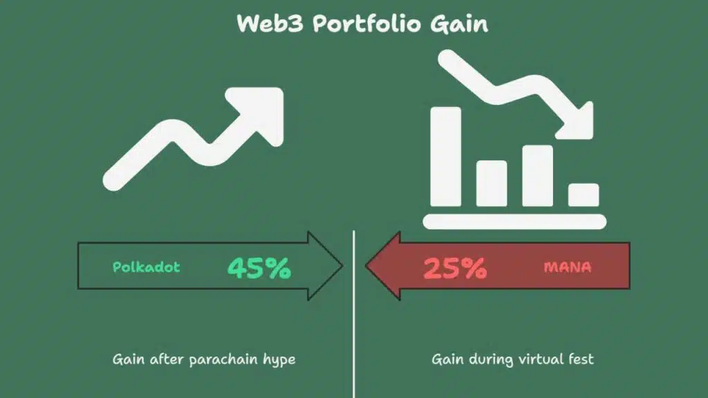Web3’s volatile, so don’t stake your whole wagon train. I keep 15% of my portfolio in Web3, backed by Bitcoin and USDC. Last summer, I dropped $40 into Polkadot after X hyped its parachains—up 45%, my kinda pioneer haul. Start small on Binance or MetaMask, testing with $20 to avoid busts. Timing’s your compass: Web3 tokens pop during metaverse events or dApp launches. I grabbed MANA last fall when a virtual fest hit, banking a 25% gain. X vibes and CoinGecko’s charts spot these surges, but TradingView’s RSI keeps me from overpaying—dodged a hyped DOT spike. Cashing out’s where I’ve lost my way; I held a 2x token too long, missing $80. Now I sell 20% at a 50% gain, 50% at a double, using Kraken’s swaps. Holding for utility, like virtual land rentals, adds nuggets like a side claim.